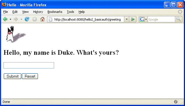 In general, the following steps are necessary for adding basic authentication to an unsecured servlet, such as the one described in Web Modules. In the example application included with this tutorial, many of these steps have been completed for you and are listed here simply to show what needs to be done should you wish to create a similar application. The completed version of this example application can be found in the directory tut-install/javaeetutorial5/examples/web/hello2_basicauth/.